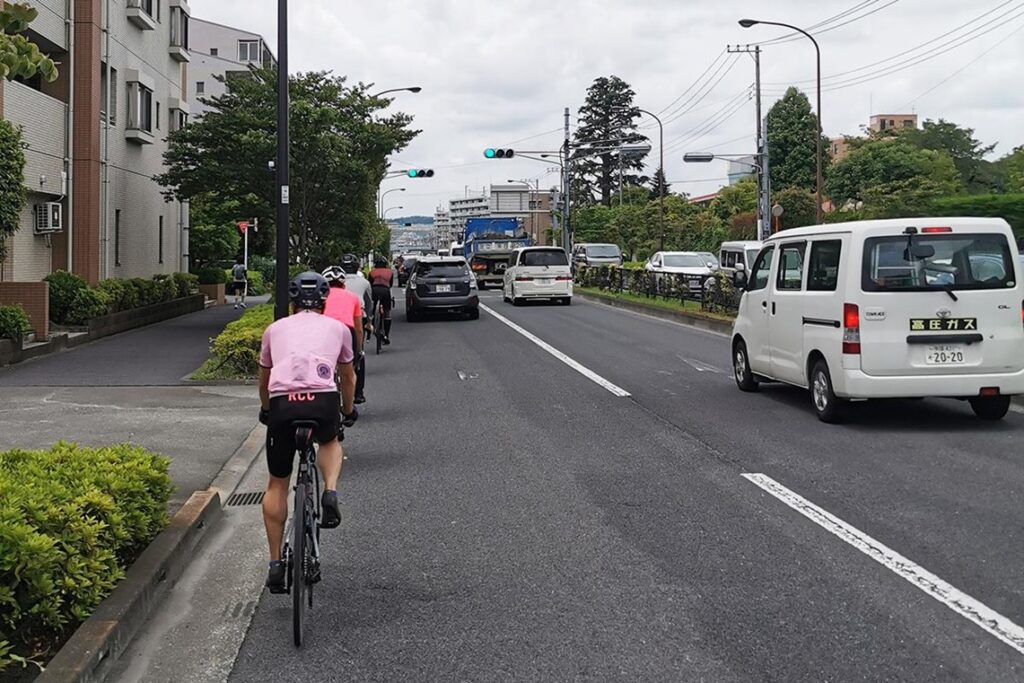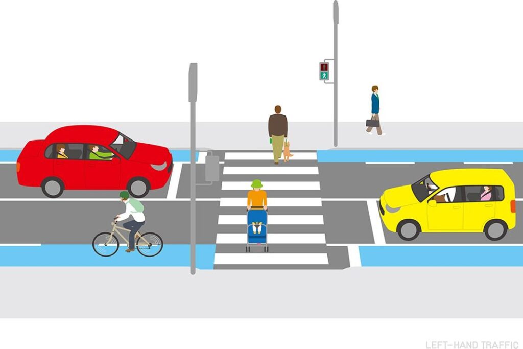 自行車務必靠左行駛為原則。右側行駛(逆向行駛)非常危險,可能導致正面碰撞或與車輛的擦撞事故。行駛位置應保持在車道左側(路側帶)。即使在人行道上行駛,也同樣需要靠左側行駛,並小心注意不要妨礙到行人。
