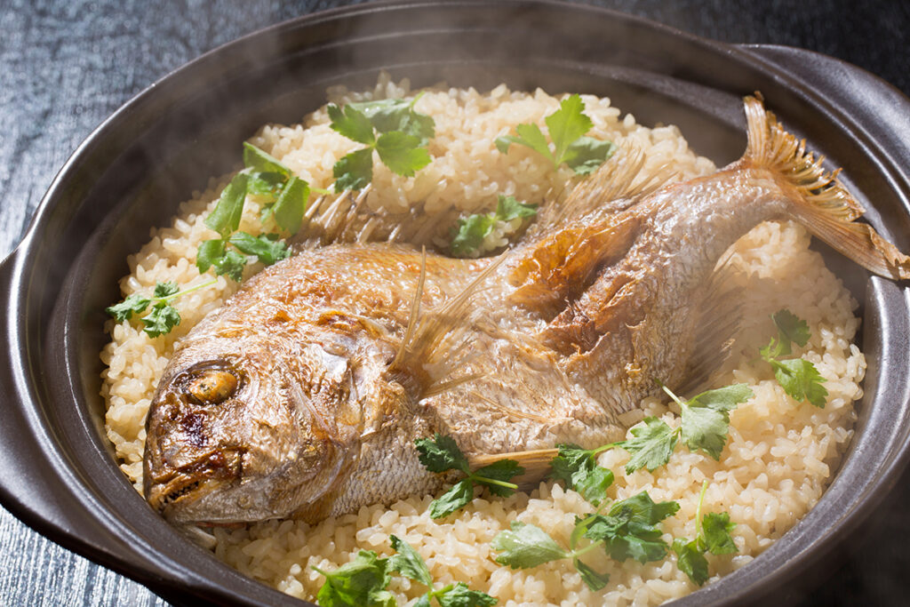 - 將整尾鯛魚與米飯一起放入土鍋或釜中炊煮