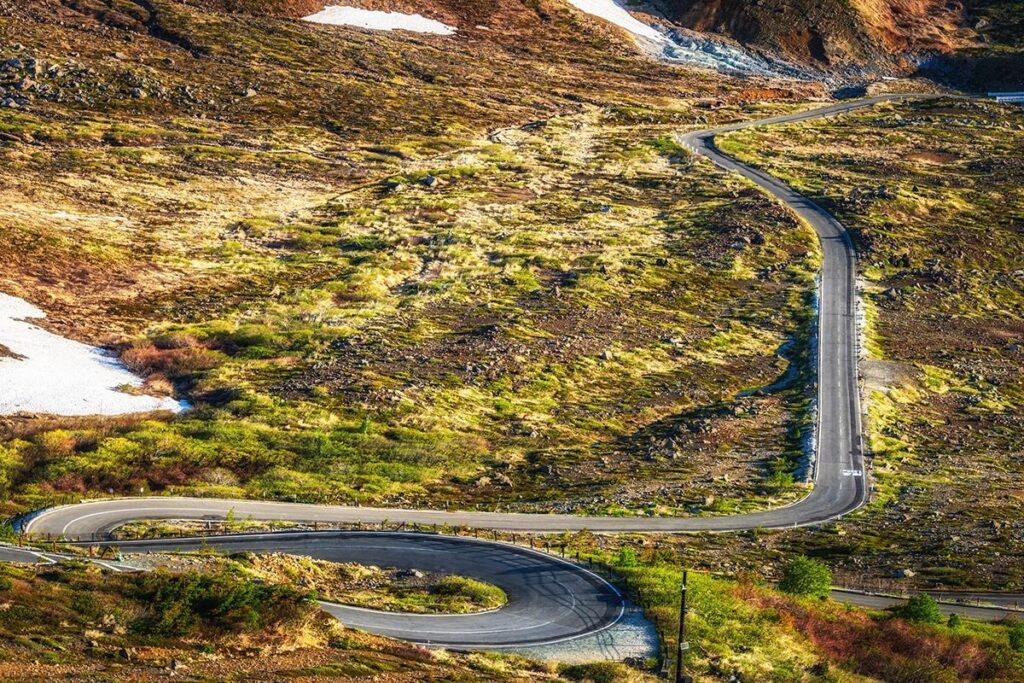 穿越 日本國道最高點・渋峠(標高 2,172 公尺)。春天能騎行在「雪之迴廊」之中,夏秋則是高原風光。