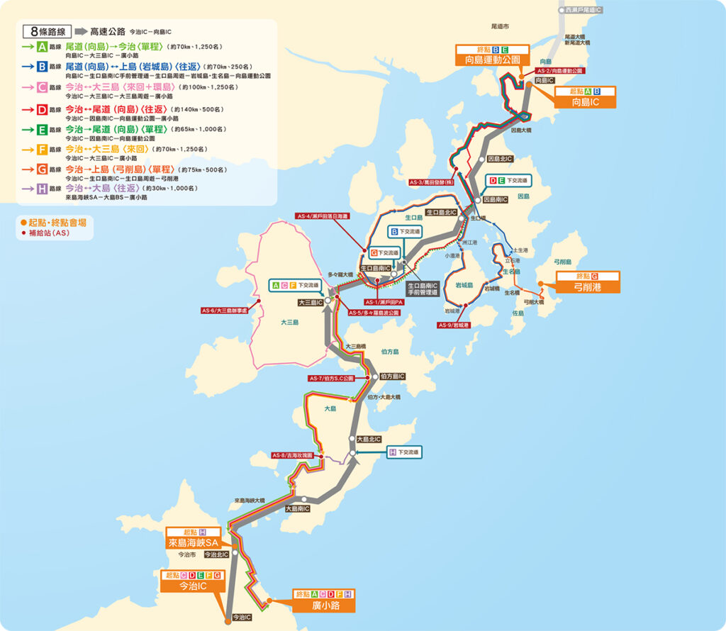 本賽事最大亮點,是能夠騎乘 西瀨戶自動車道 主線道路。西瀨戶自動車道平日僅限汽車行駛(日本高速公路系統的一部分),活動當天則全面開放給自行車騎士。寬闊筆直的柏油路面與俯瞰瀨戶內海的全景視野,將帶來一生難忘的騎行體驗。沿途補給站還提供瀨戶內檸檬、蜜柑等當地特產與特色料理,讓你在運動之餘,也能品味日本地方文化的溫度。